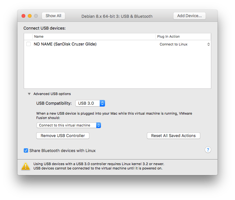 If you run into problems, you have a few options. First, power off your VM. Go to “Settings” -> “USB Devices” and leave this settings screen up next to your powered-off VM. (You can also expand your toolbar and look at the USB icon). Now, power on the VM. Immediately, you should see the USB Settings screen update with a check next to your USB device: