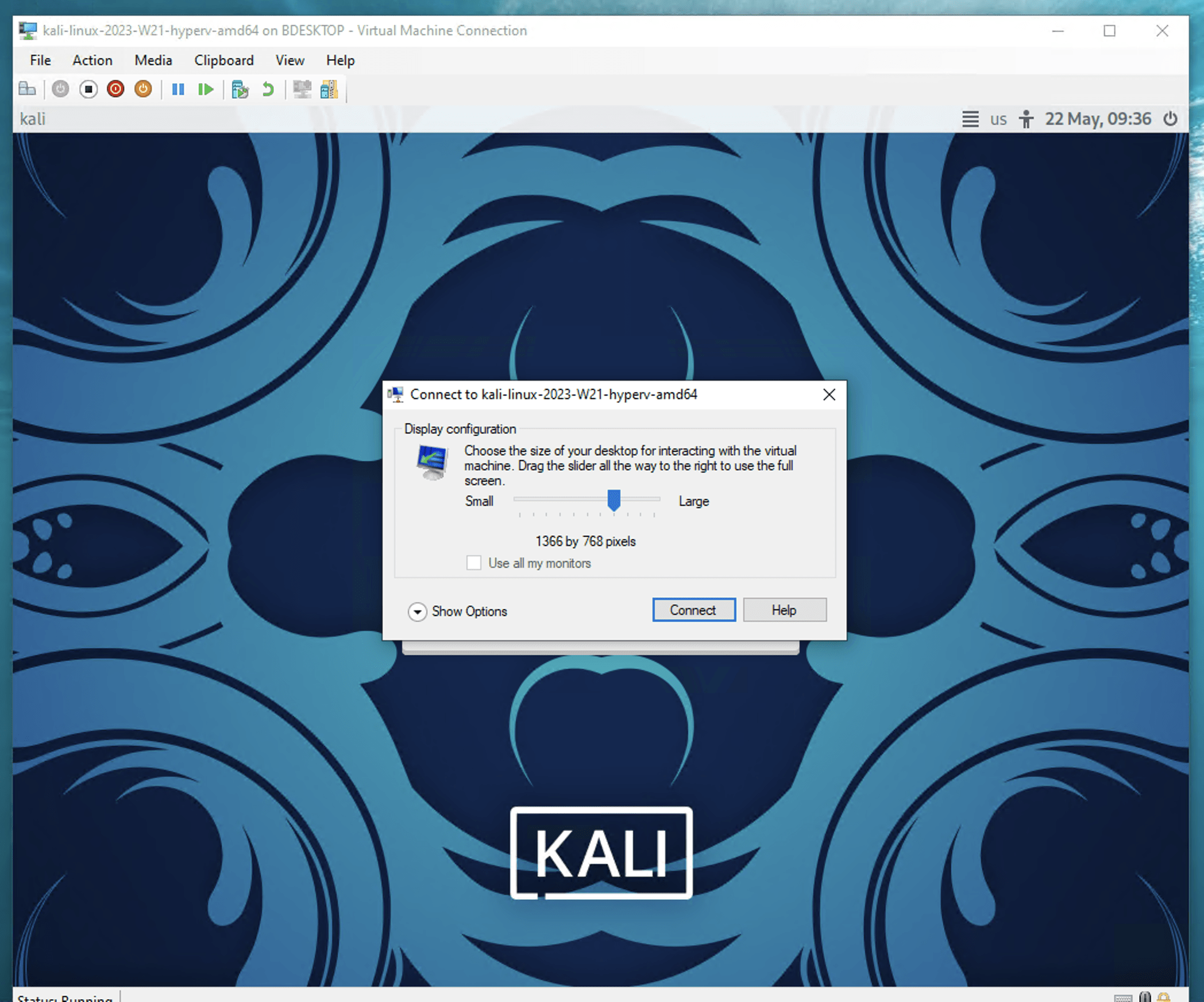 We then launch the Hyper-V Manager, right-click on the Kali VM, click Start, then right-click again and click Connect. We should see the usual Kali login screen, or rather, just have a glimpse of it, before a popup window appear in the foreground: