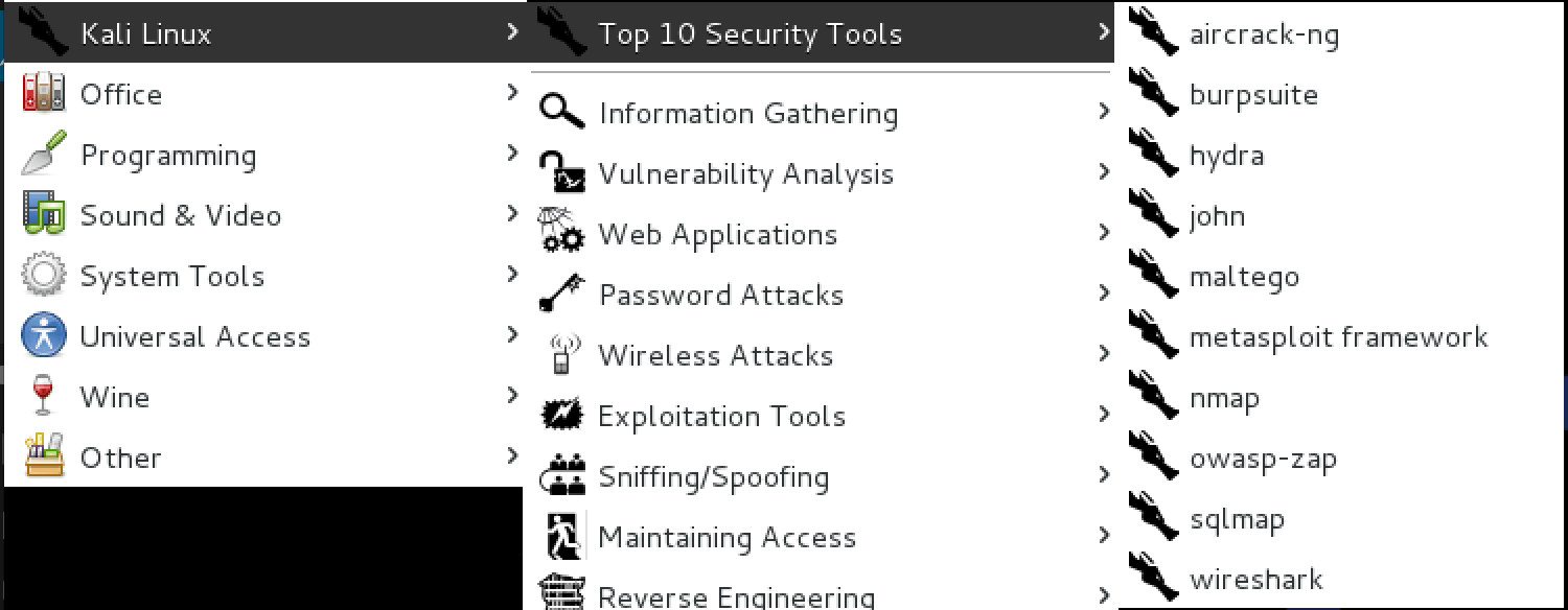 In Kali Linux, we have a sub-menu called “Top 10 Security Tools”. The kali-linux-top10 metapackage will install all of these tools for you in one fell swoop. Installation Size: 3.5 GB