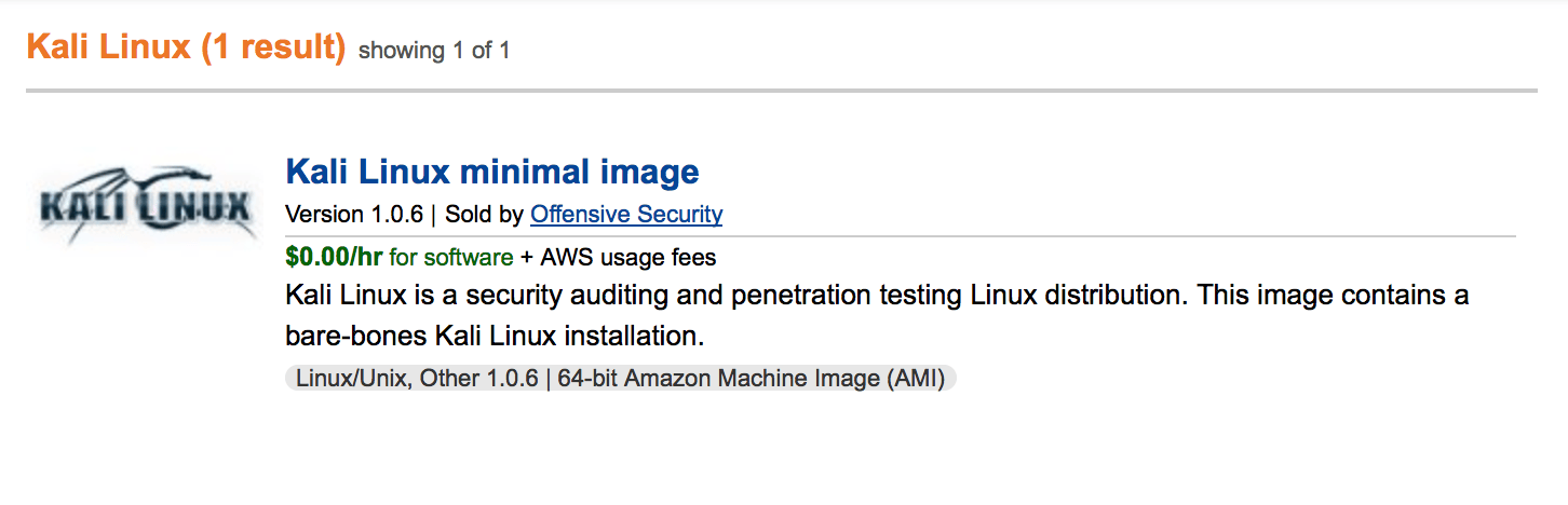 After several weeks of “back and forth” with the Amazon EC2 team, Kali Linux has finally been approved into the Amazon EC2 marketplace. This means that our users can now activate and access Kali Linux instances in the Amazon cloud quickly and easily. We are “selling” these images on the marketplace for free, so other than the regular amazon charges, there no extras to pay. We have currently published a single 64 bit minimal instance of Kali Linux, which can be found in the marketplace by searching for “Kali Linux” or accessed via its direct link.