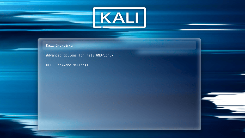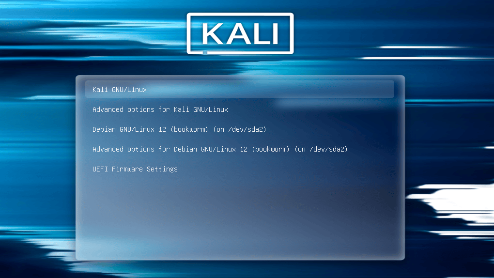 This guide assumes that you have Kali Linux installed alongside another operating system. In this setup, when you boot your machine, you’re supposed to see the GRUB boot menu (GRUB is the bootloader installed by Kali Linux). This menu lists the different operating systems that are installed, so that you can select which one to boot.