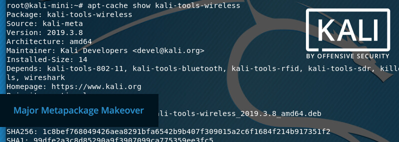 With our 2019.3 Kali release imminent, we wanted to take a quick moment to discuss one of our more significant upcoming changes: our selection of metapackages. These alterations are designed to optimize Kali, reduce ISO size, and better organize metapackages as we continue to grow.