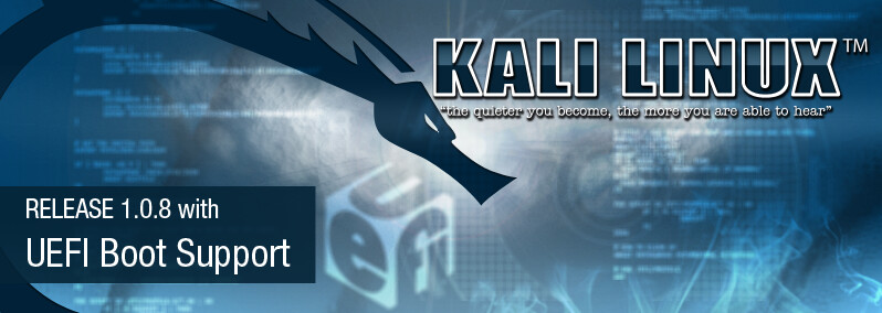 The long awaited Kali Linux USB EFI boot support feature has been added to our binary ISO builds, which has prompted this early Kali Linux 1.0.8 release. This new feature simplifies getting Kali installed and running on more recent hardware which requires EFI as well as various Apple Macbooks Air and Retina models.