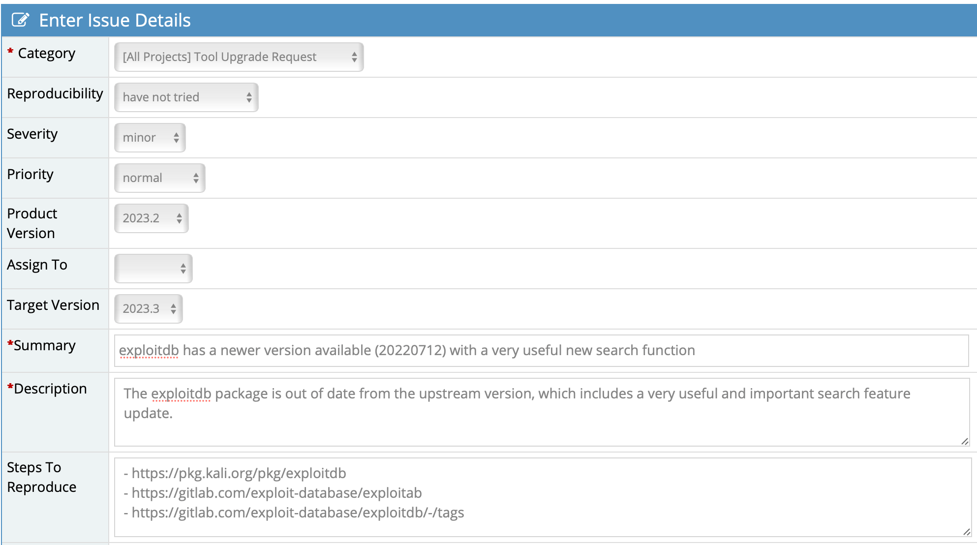 The Bug Tracker is a great place to help out Kali, whether reporting a bug or helping to fix one. When reporting a bug, we ask that you follow our documentation on how to. When helping others with their bug reports, we ask that you use information you know is trust worthy. Helping out on a bug tracker ticket can be as simple as just being able to reproduce the problem or as complex as submitting a merge request to fix the issue yourself. Everything is appreciated.